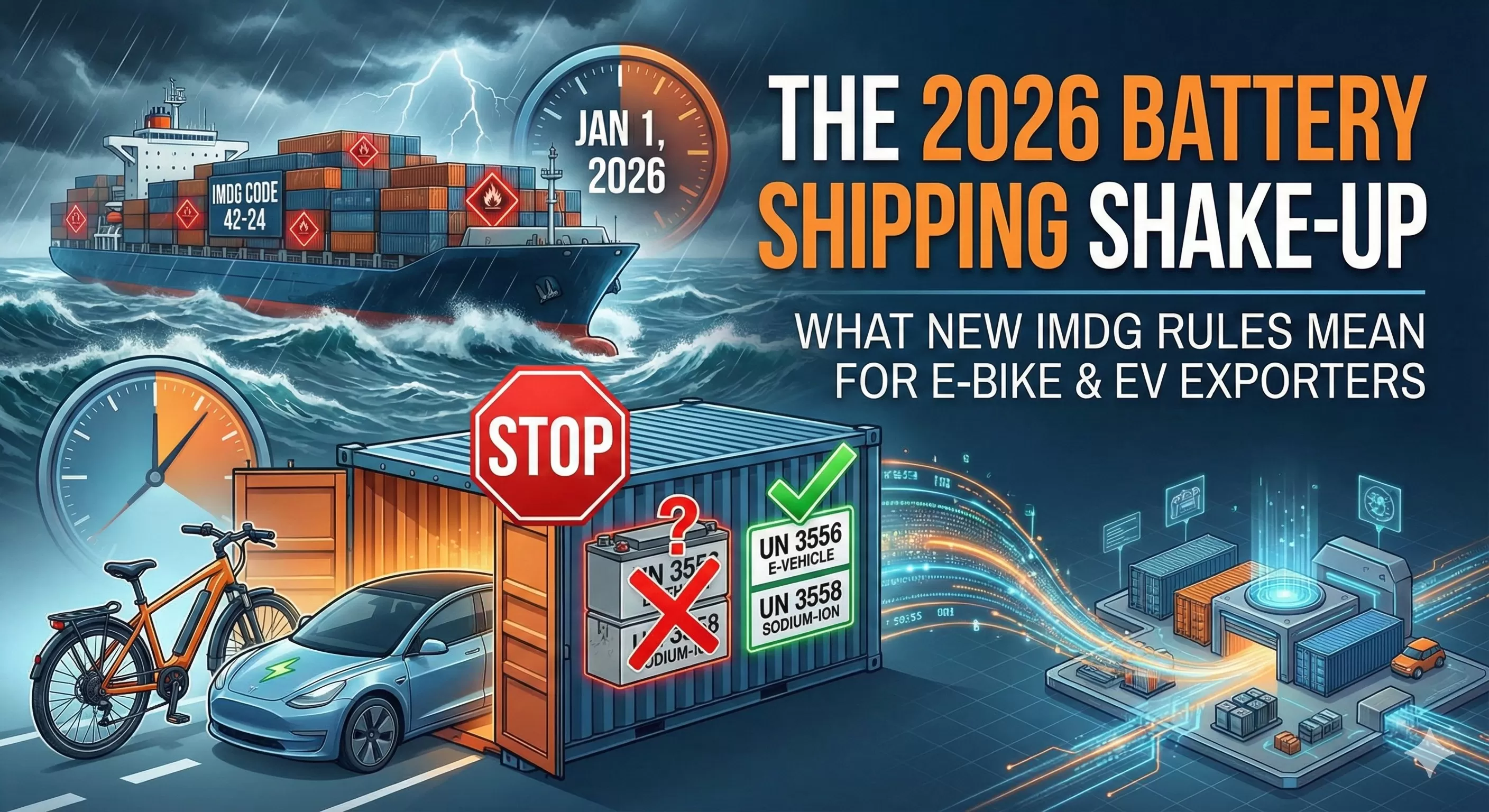 If you are importing E-bikes, E-scooters, or the new generation of Sodium-ion batteries from China, your supply chain is about to face a major regulatory checkpoint.With the IMDG amendments becoming mandatory in 2026 (specifically Amendment 42-24), shippers face a strict deadline.